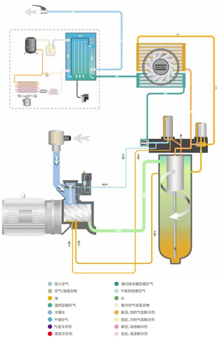· Glacann triomadóir ionsuite malartóir teasa frithshrutha, deighilteoir uisce ionsuite, agus is féidir leis an triomadóir a choigeartú de réir ualach an chomhbhrúiteora aeir.