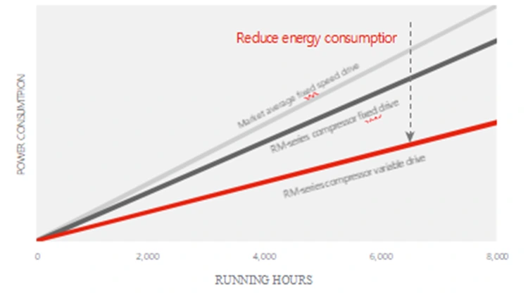 Tá príomh-aonad ardéifeachtúlachta nua-aimseartha feistithe ag gach comhbhrúiteoir aeir sraith RM, a chomhcheanglaíonn mótar luas seasta IE3 agus teicneolaíocht mótair minicíochta inathraithe ECO * - PM VSD IE5, ag cabhrú leat suas le 12-30% a shábháil ar chostais fuinnimh.