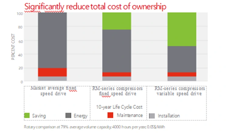 Glacann na Comhbhrúiteoirí Aeir Scriú RM príomh-aonad ardéifeachtúlachta úrnua, a chomhcheanglaíonn IE3 minicíocht sheasta agus inverter maighnéad buan ECO*-PM IE5 teicneolaíochtaí mótair atá tíosach ar fhuinneamh, rud a shábhálann tú suas le 12-30% ar chostais leictreachais.